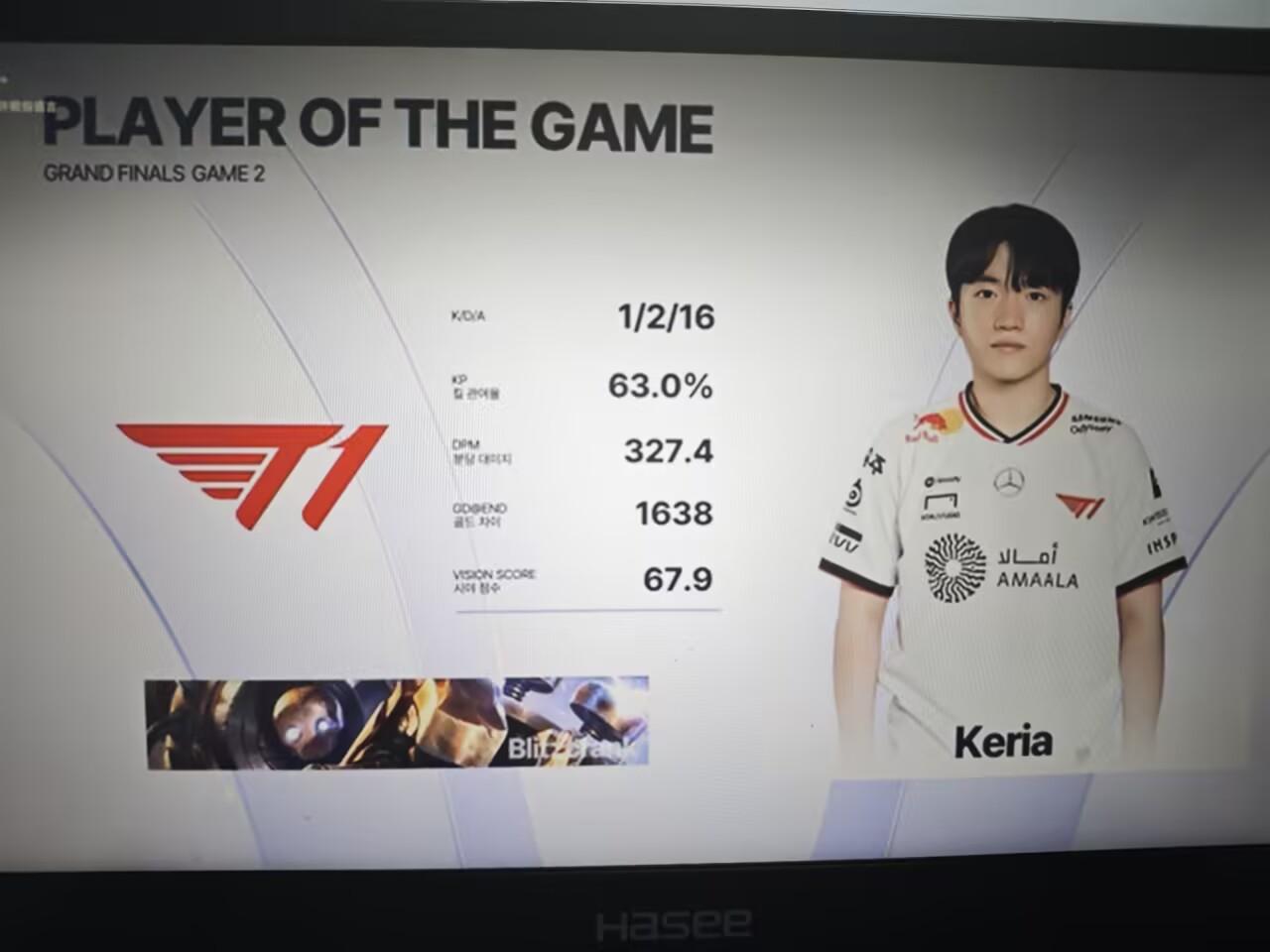 Keria机器人砍下1/2/16的战绩,拿下T1对阵HLE次局MVP