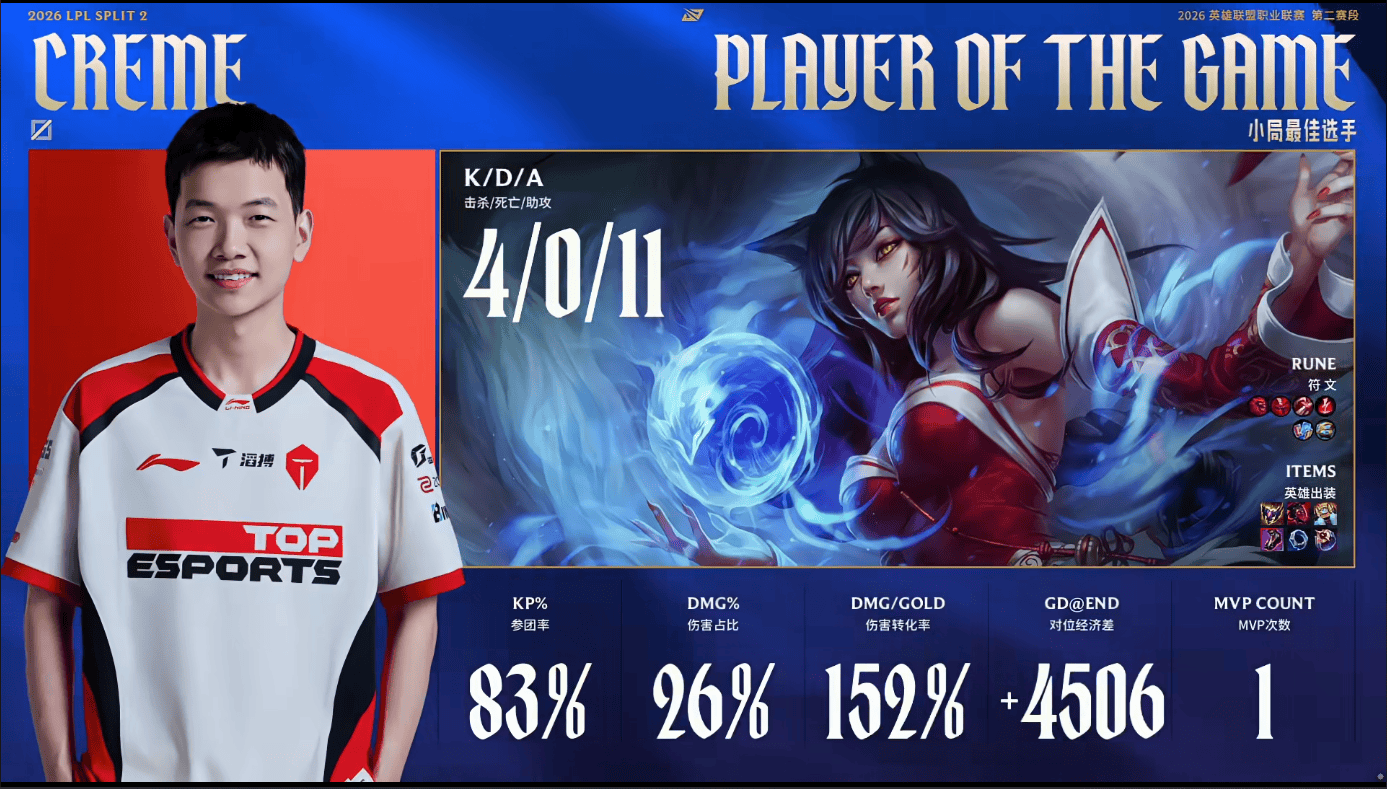 Creme狐狸砍下4-0-11的战绩,斩获TES对阵WE次局MVP
