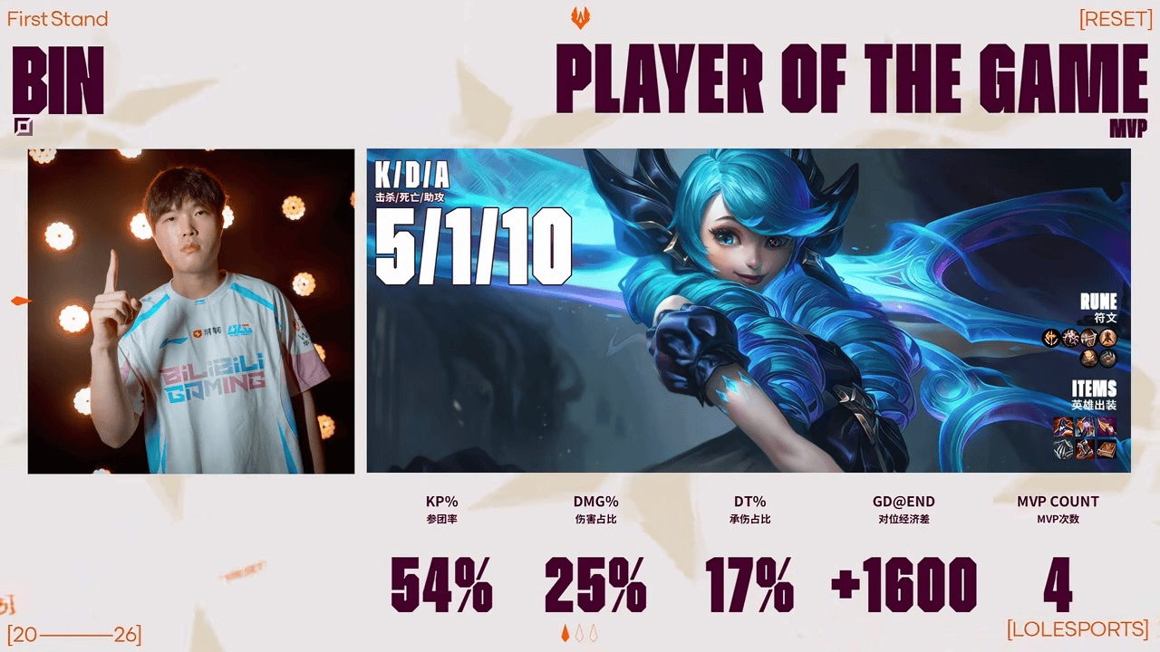 Bin格温砍下5/1/10的战绩,拿下BLG对阵G2次局MVP