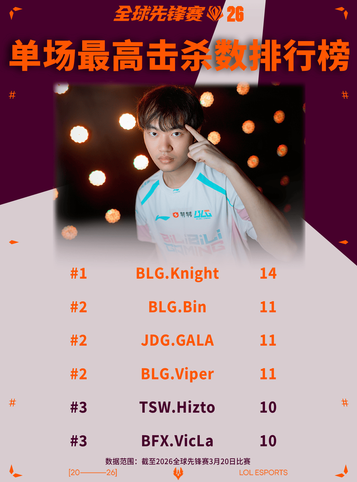 2026全球先锋赛至今单场最高击杀数排行榜:Knight位列第一