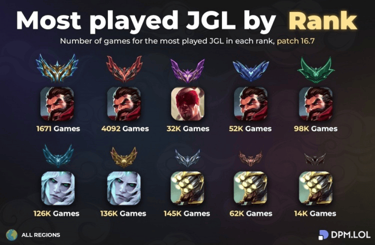 各段位出场率最高打野:下三剑圣,铂黄金佛耶戈,王者男枪