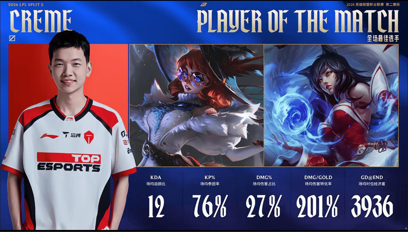 Creme两局合砍15-3-22的战绩,斩获TES对阵WE系列赛MVP