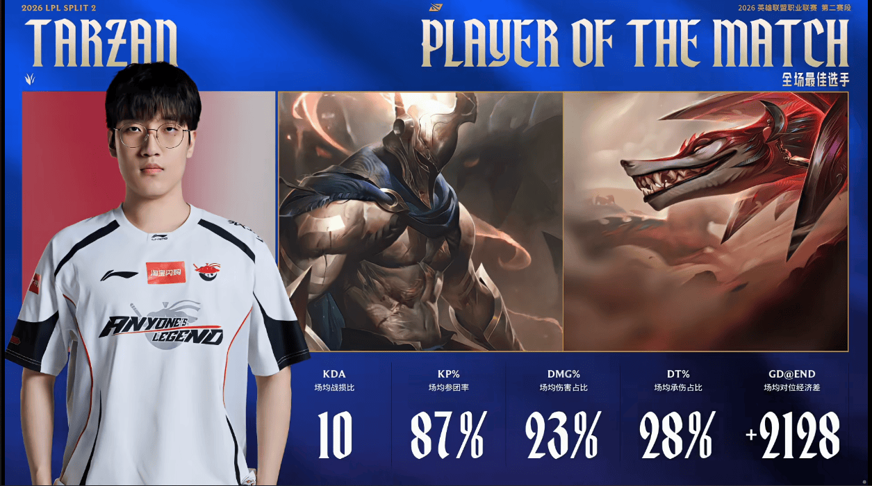 Tarzan两局比赛打出场均10 KDA,斩获AL对阵WBG大场MVP