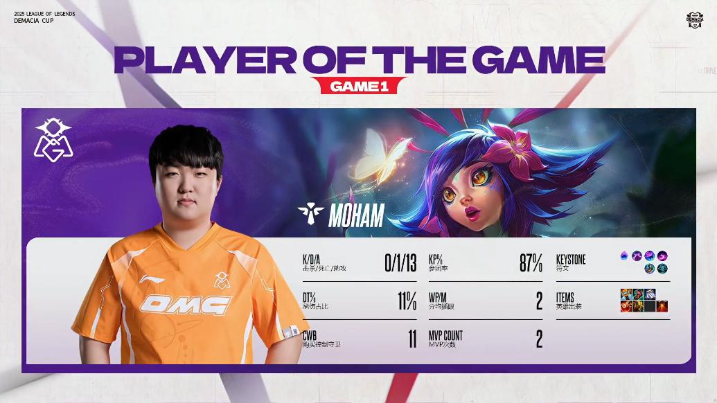 Moham妮蔻打出0/1/13战绩,斩获OMG对战LNG首局MVP