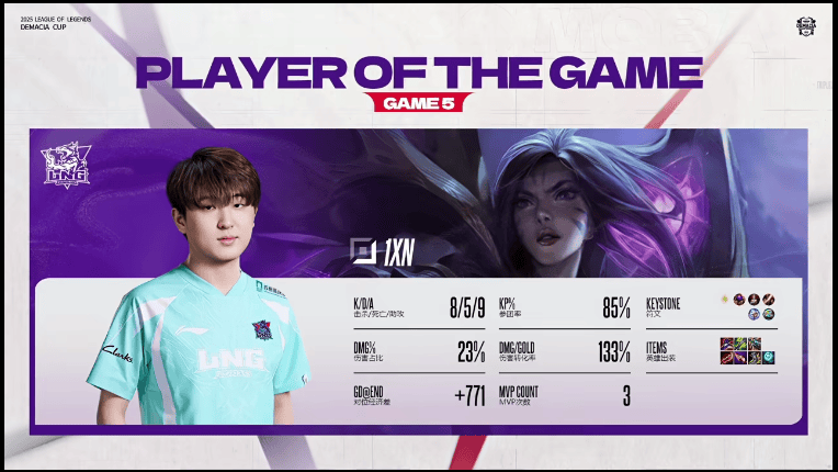 1xn使用卡莎打出8/5/9战绩,斩获OMG对阵LNG第五局MVP