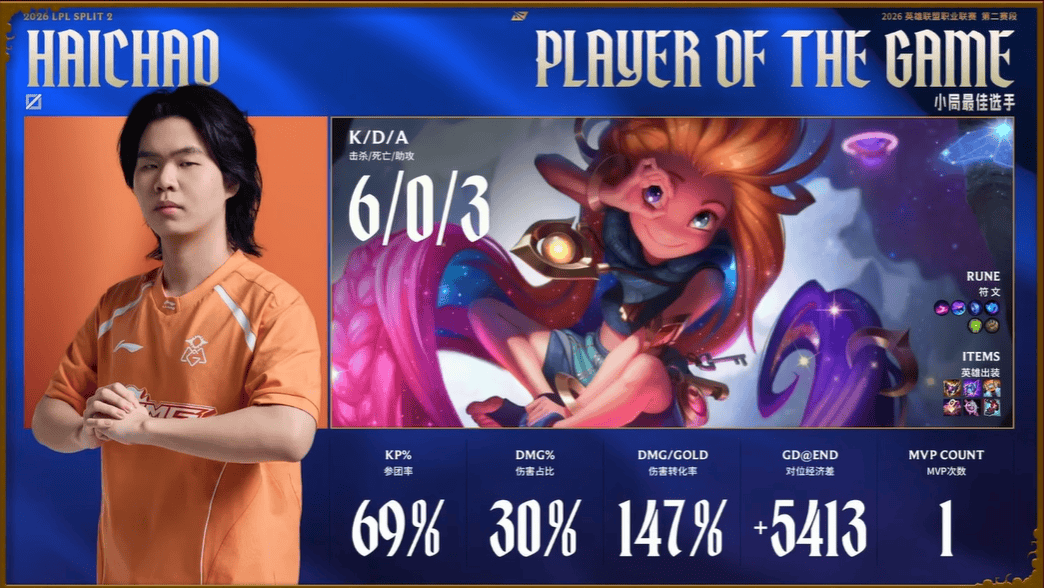 Bin狼母打出6/1/10战绩,斩获BLG对阵WBG第二局MVP
