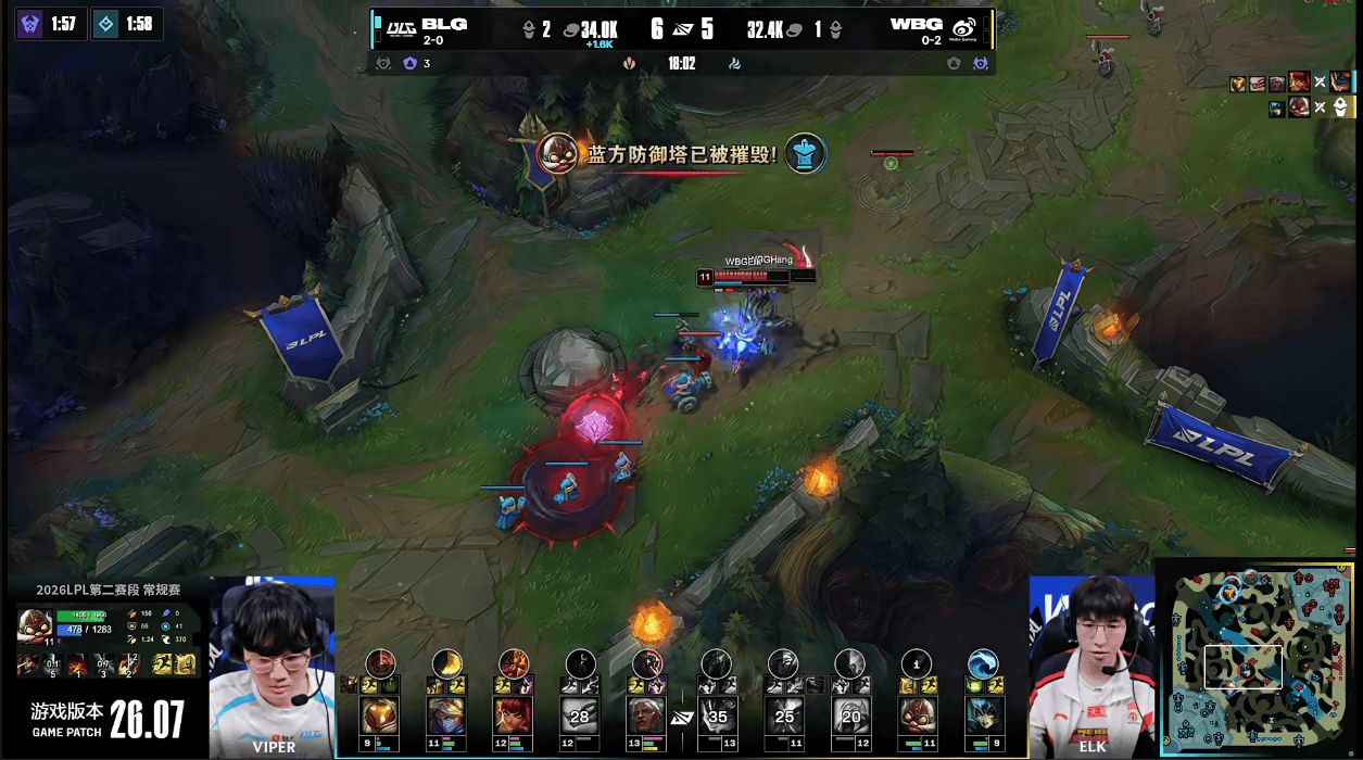 BLG上路率先发难越塔,击杀WBG三人后并拿下上路一塔