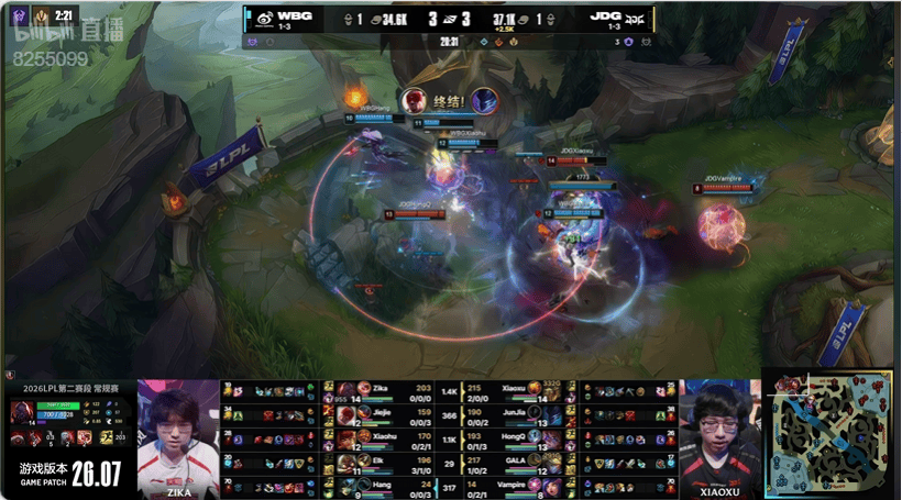 WBG野辅双双支援下路闪现击杀GALA芸阿娜拿下一血