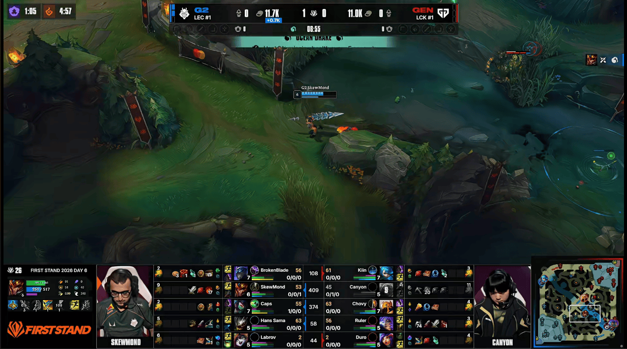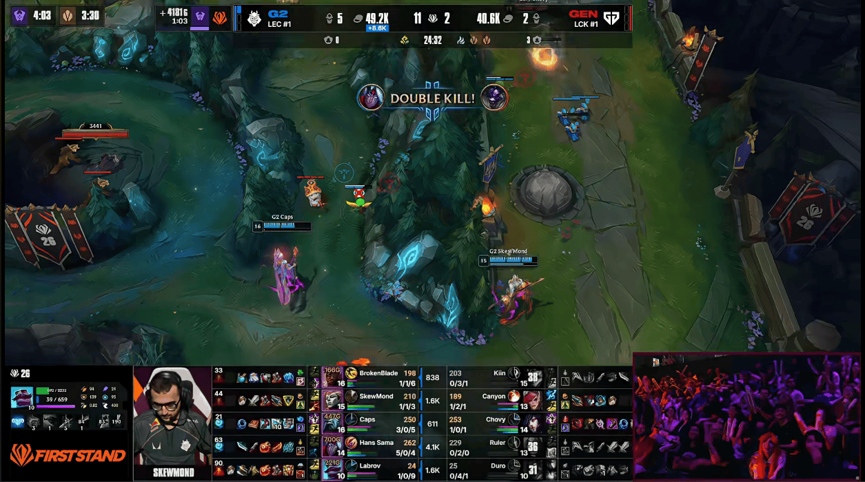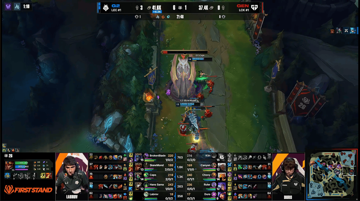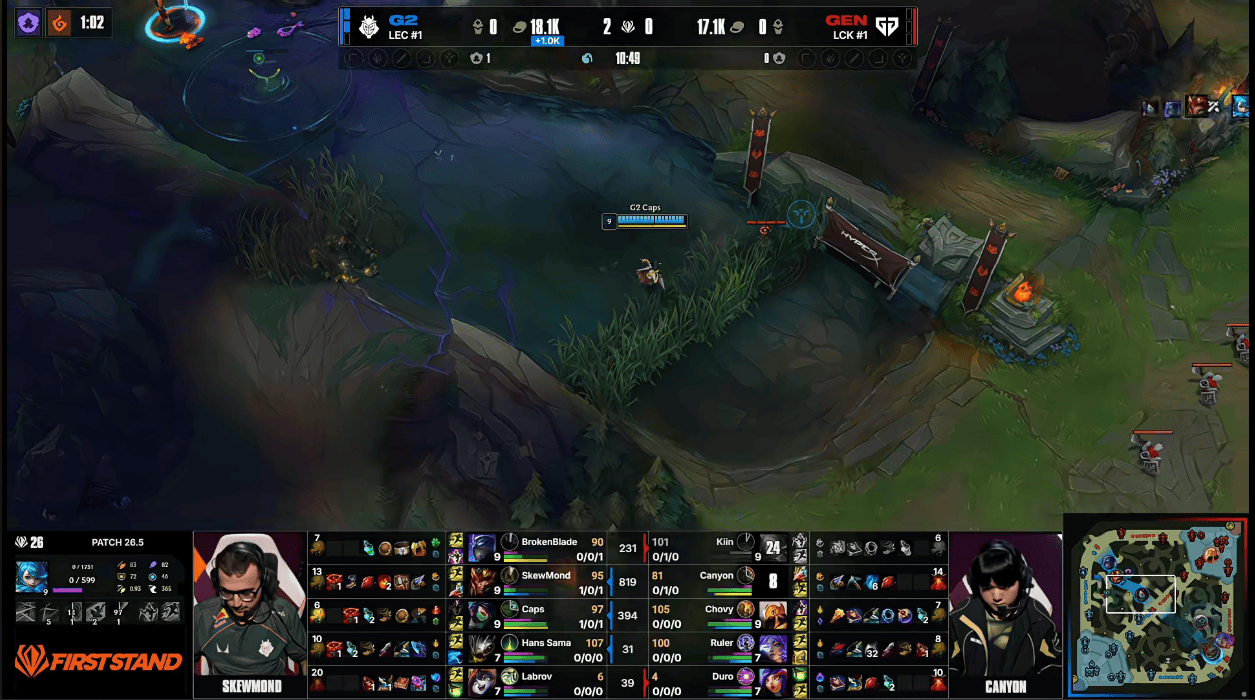 Canyon被打残状态,Caps拿下一血SkewMond拿下小龙