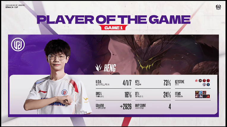 Heng使用石头人打出4/1/7战绩,斩获LGD对阵AL第一局MVP