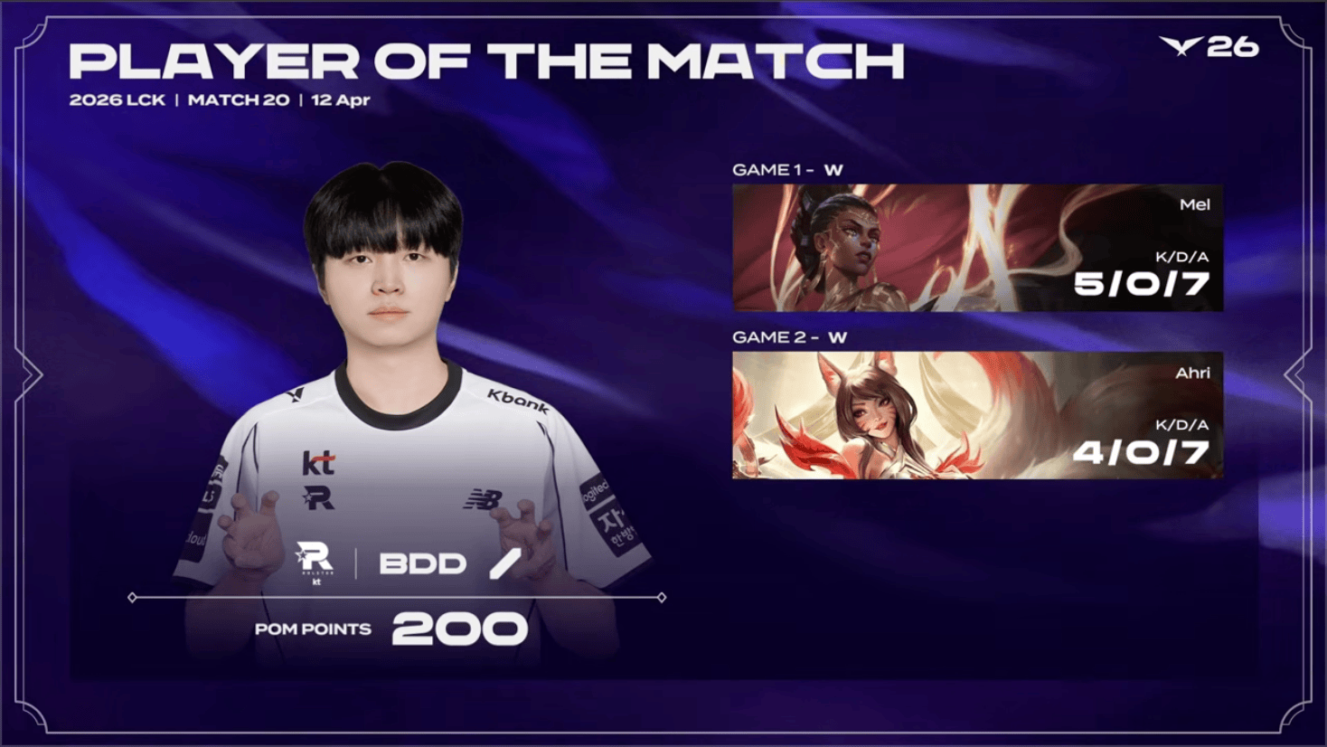 Bdd整个系列赛发挥出色,斩获KT对阵BRO系列赛POM