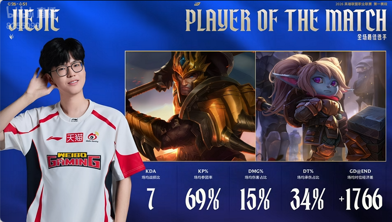 Jiejie波比打出2/1/2战绩,拿到WBG对阵JDG次局比赛MVP
