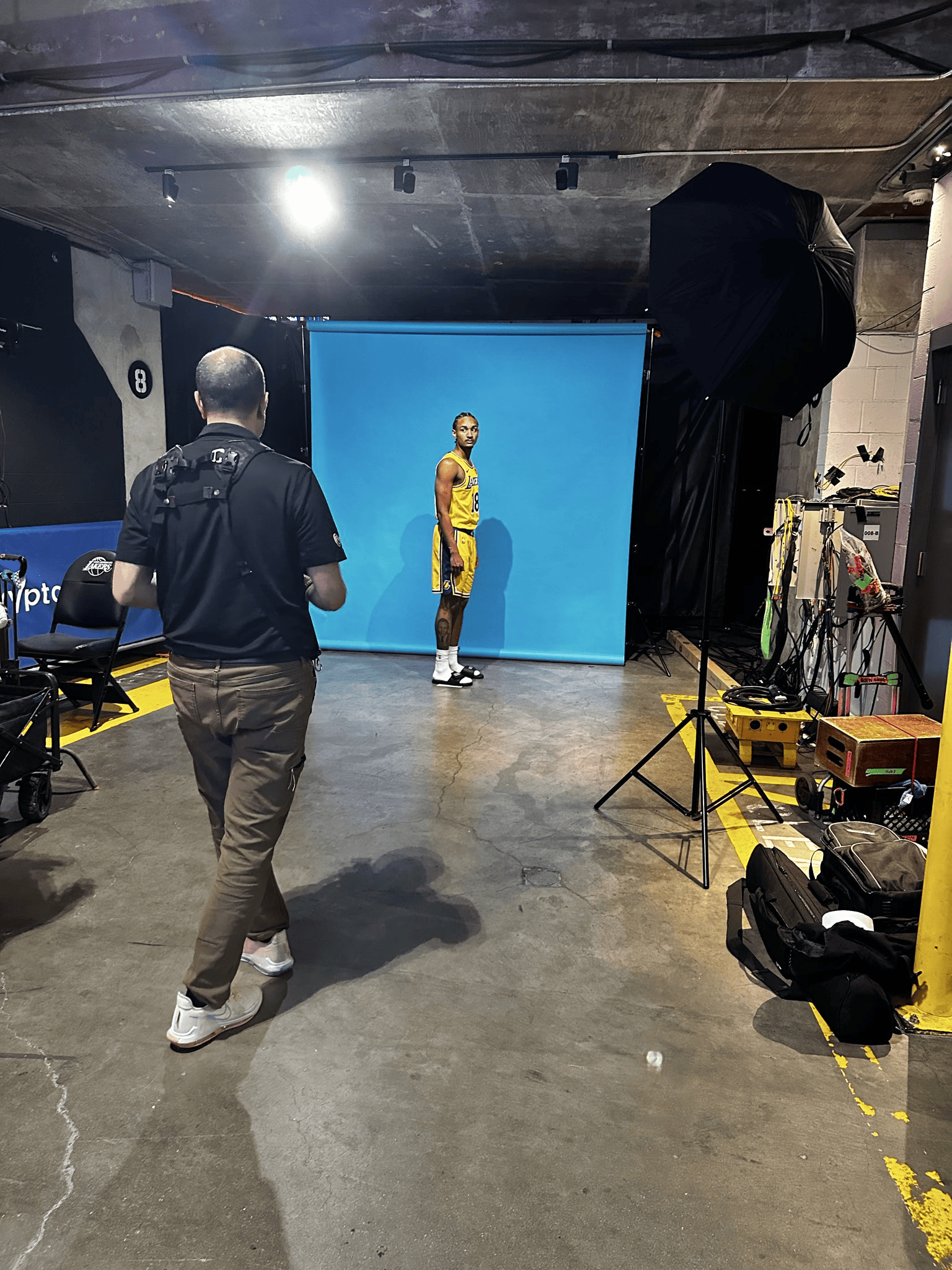 湖记:湖人新援科比-巴夫金在湖人对阵雷霆赛前拍摄定妆照
