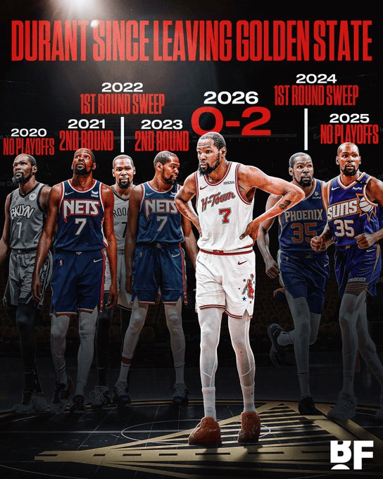 杜兰特9失误追平季后赛生涯最高,也是离开勇士后的单场最高
