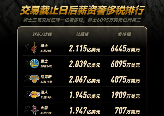 交易截止日后薪资奢侈税排行:骑士狂降一亿奢侈税