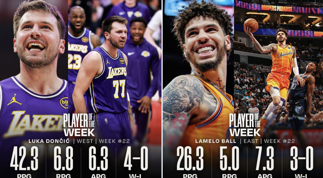 NBA最新一期周最佳球员:西部东契奇,东部拉梅洛-鲍尔
