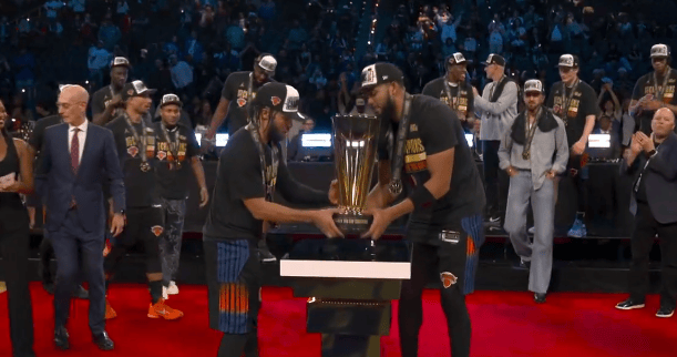 捧杯时刻!布伦森和唐斯捧起NBA杯冠军奖杯,和全队一起庆祝