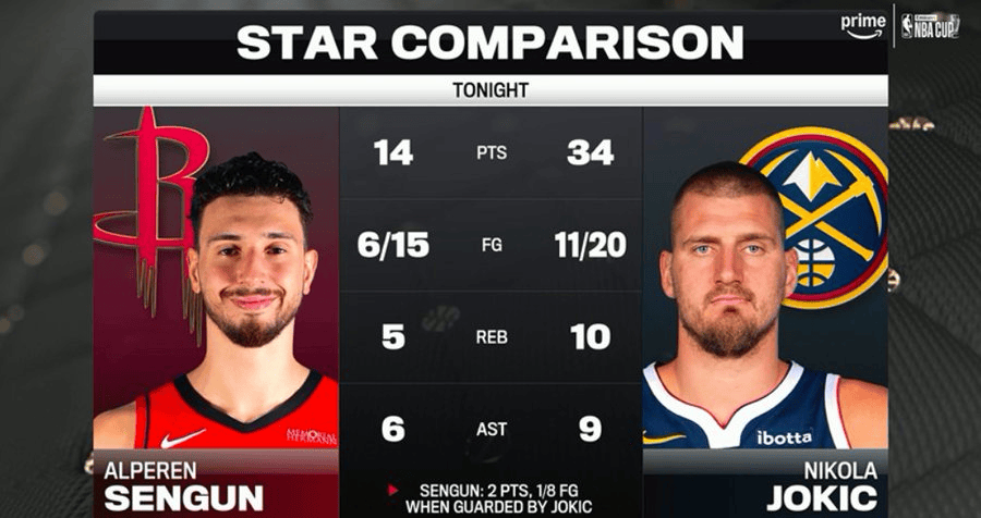 美媒晒约基奇和申京今日数据对比:34+10+9 vs 14+5+6