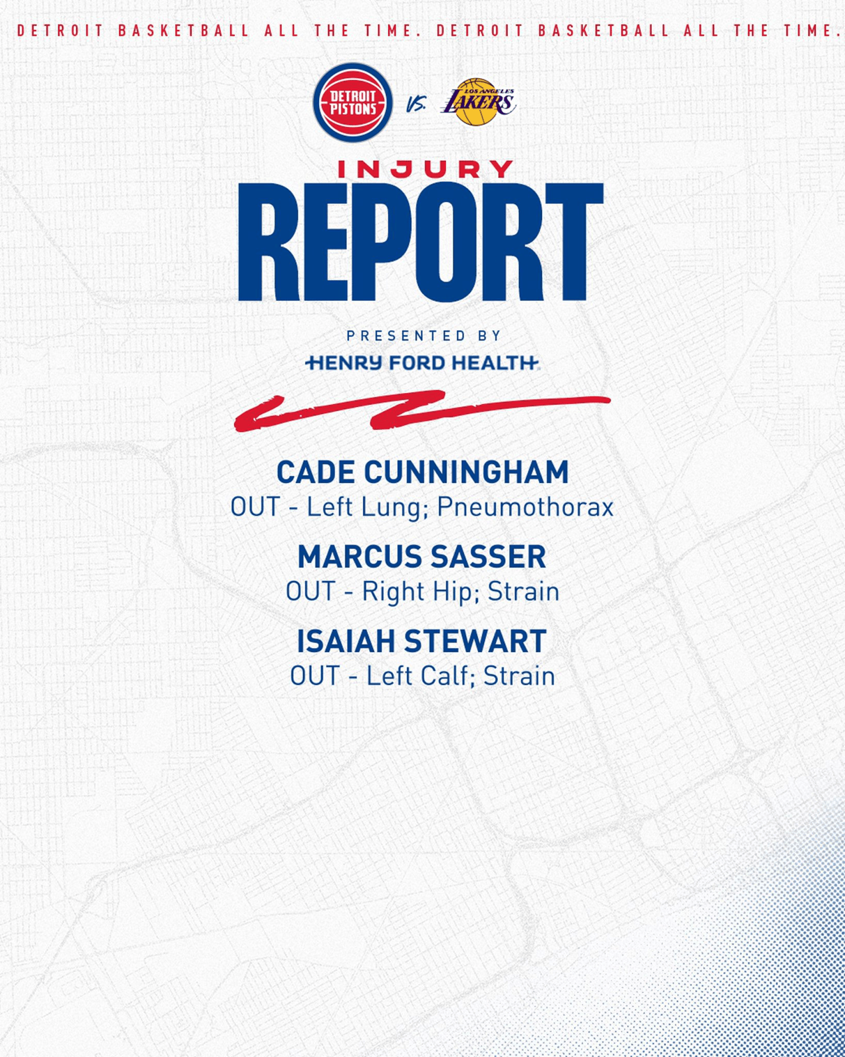 活塞伤病更新:斯图尔特、坎宁安与萨瑟均缺席对阵湖人比赛