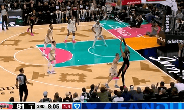 文班亚马三分线外后仰跳投继续命中,马刺打出17-2高潮