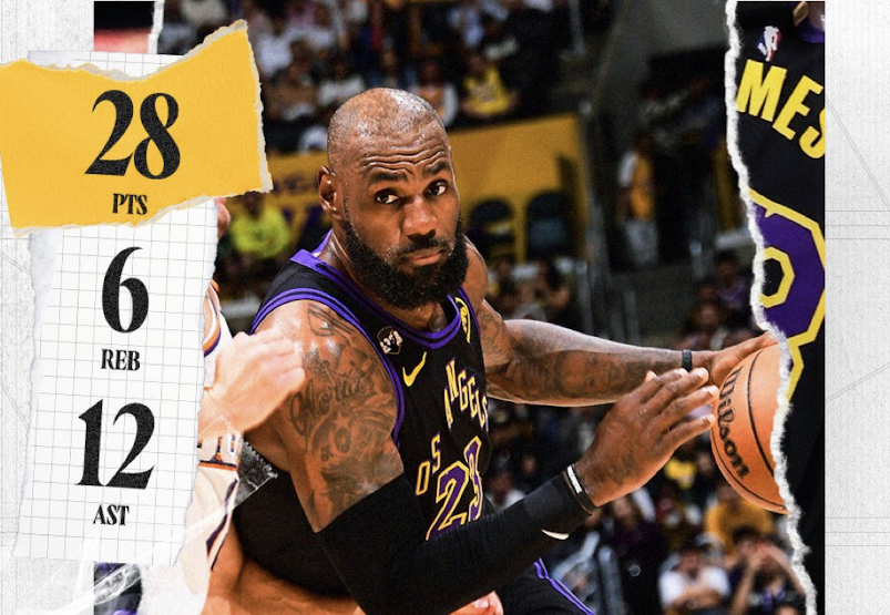 詹姆斯穿着小麦色Lebron23,得到28分6篮板12助攻4抢断