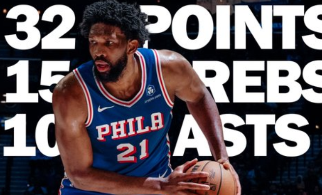 76人官方发布恩比德数据海报:全场32分15板10助,砍下三双