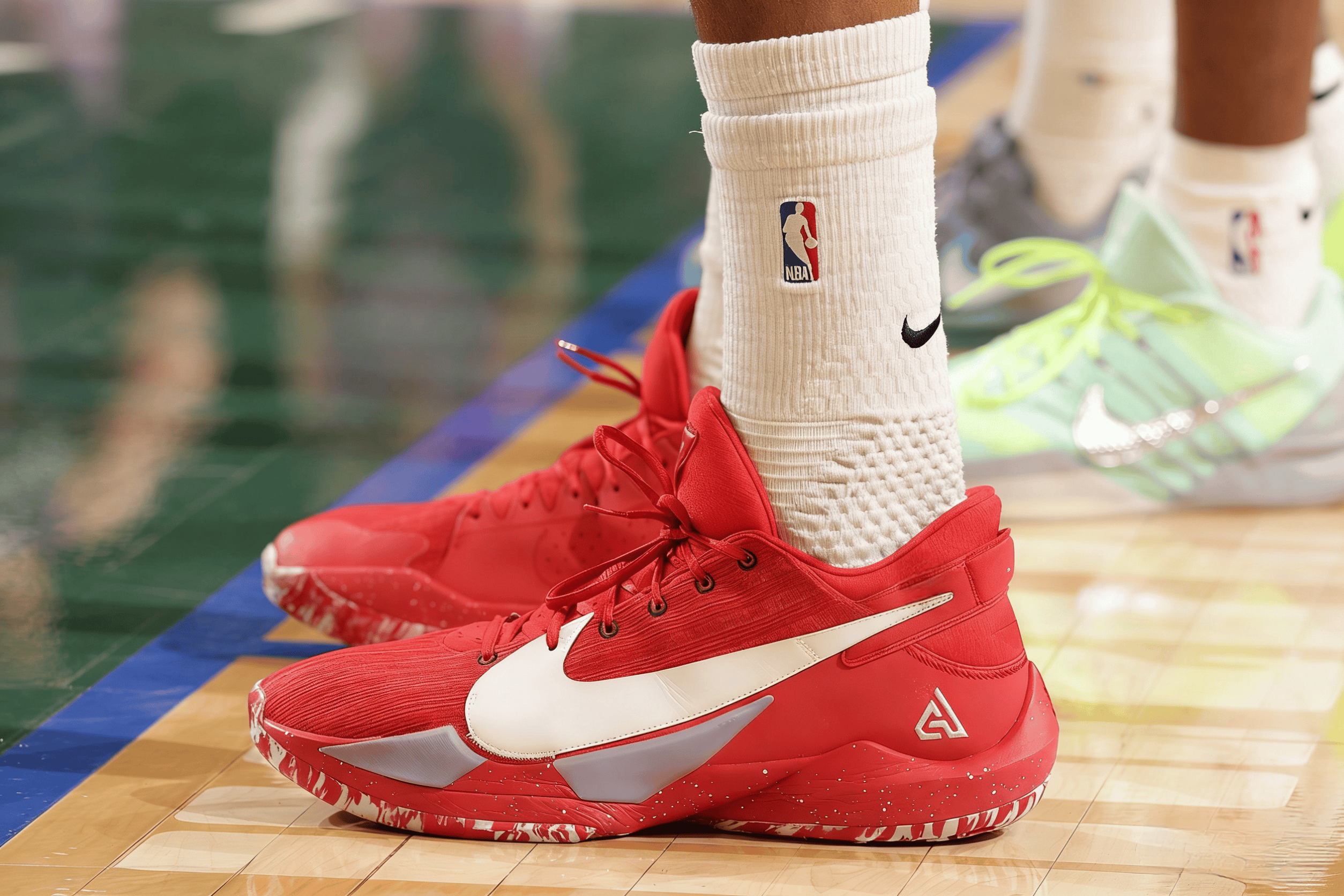 虎扑阿德托昆博穿着红色Freak2,得到25分8篮板5助攻1抢断