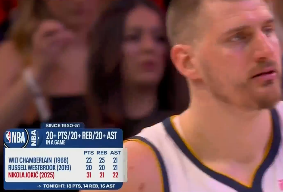 约基奇生涯17次单场20+15+15,除他外联盟近40年无人超7次