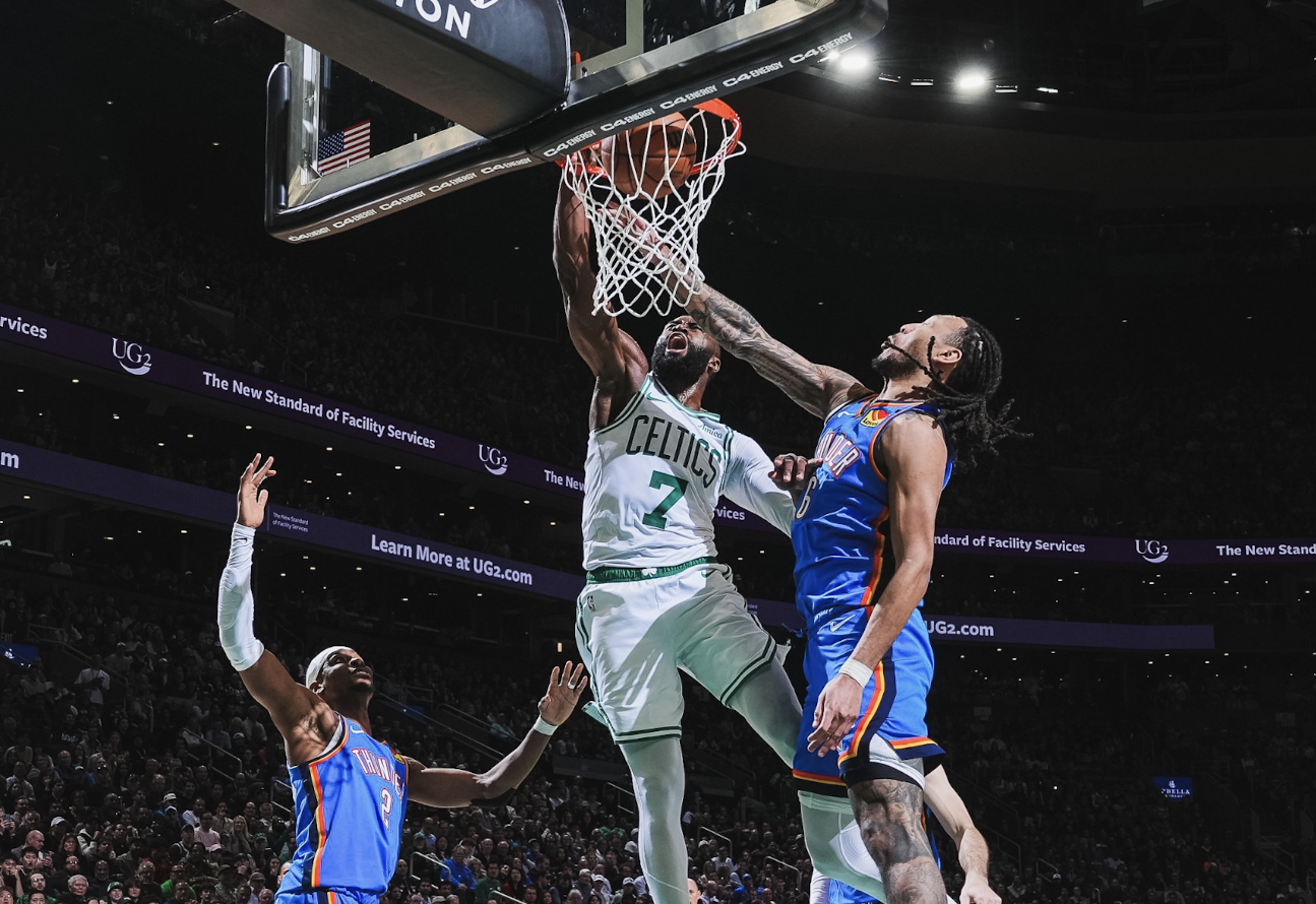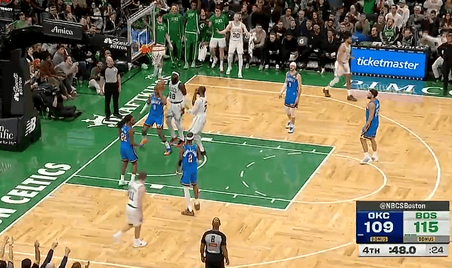 虎扑 11回复杰伦-布朗抛投打进砍下31分,凯尔特人还剩1分钟领先雷霆8分
