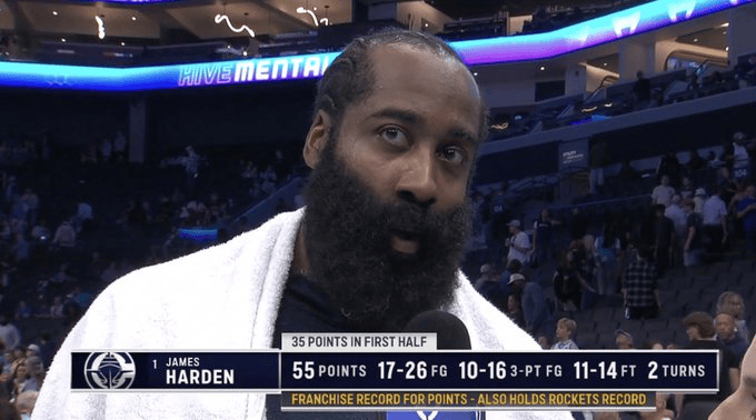 仅次于科詹库!哈登成为历史年龄第四大拿下55分的球员