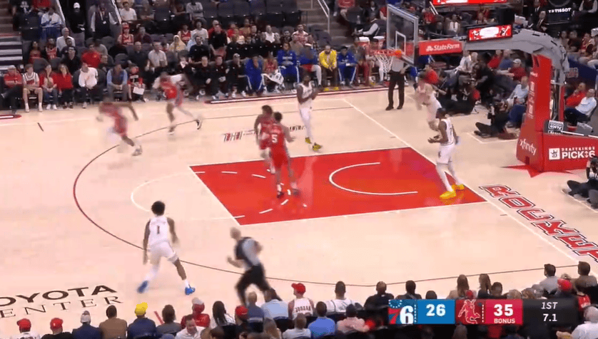 伊森轻巧转身放篮得手,随后奥科吉三分命中火箭8分领先