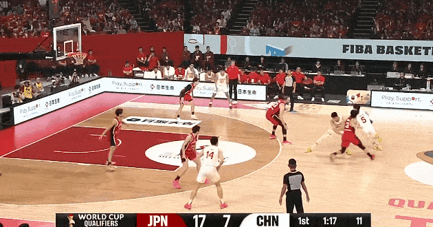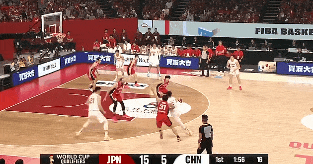 胡金秋中距离跳投终于投进,中国男篮13中3目前7-15落后日本