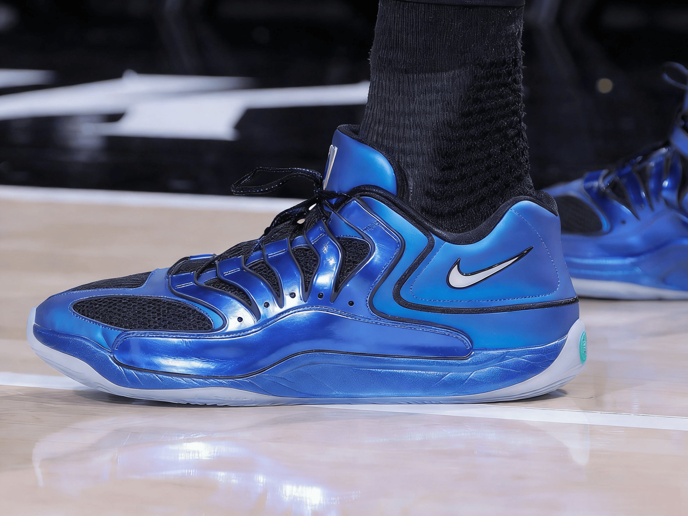 杜兰特穿着蓝喷配色KD18,得到23分4篮板6助攻