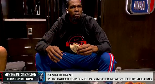 虎扑火箭与森林狼比赛赛前,杜兰特正吃着馅饼进行加餐