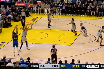 格林迎着文班亚马长臂防守底角三分投进,勇士仅落后马刺5分