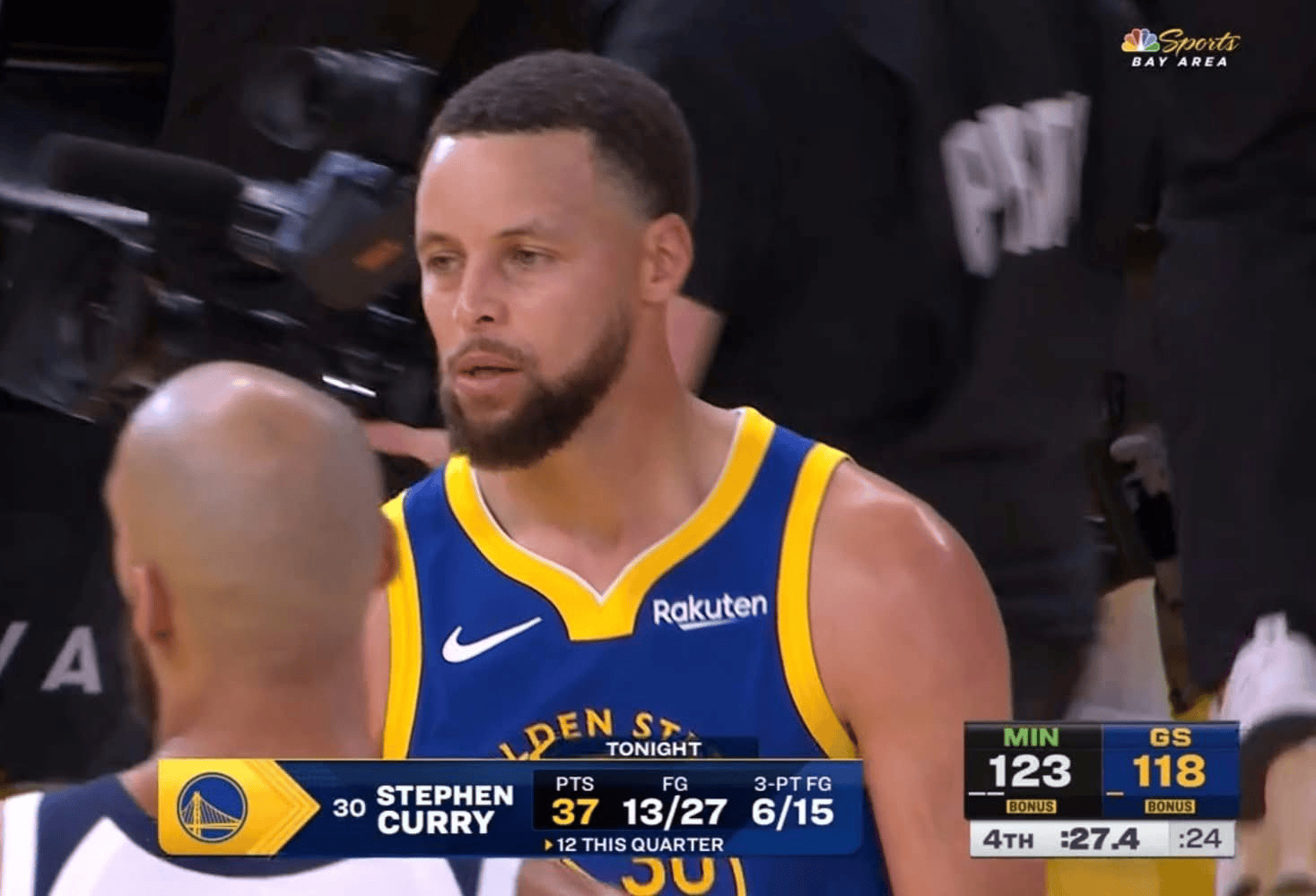 库里超远三分强投命中已得30分,勇士追到7分森林狼叫停