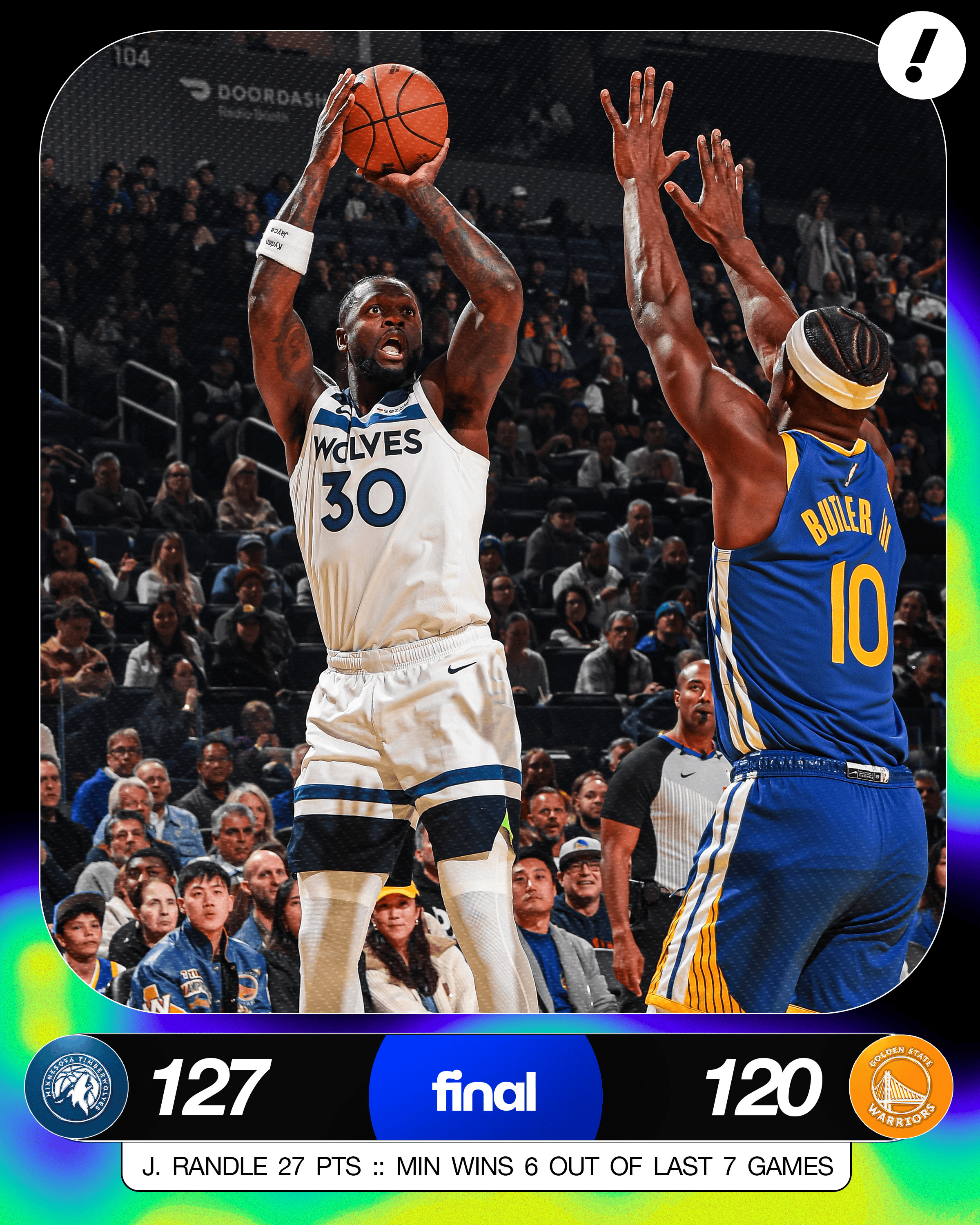 森林狼战胜勇士后过去7场取得6胜1负,领先第七太阳2个胜场