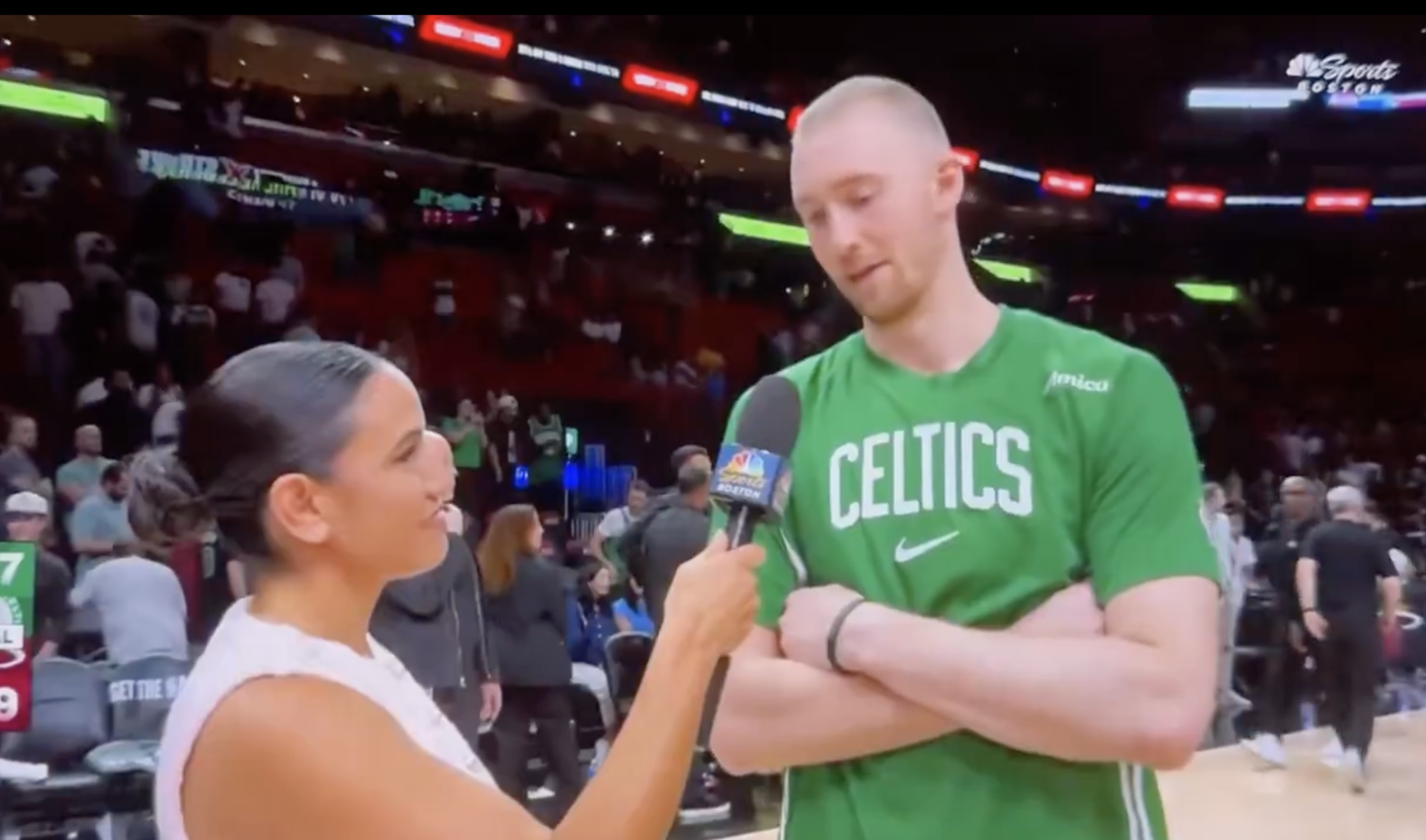 虎扑NBA官方晒汤姆-布雷迪场边观战绿军对阵热火比赛的瞬间