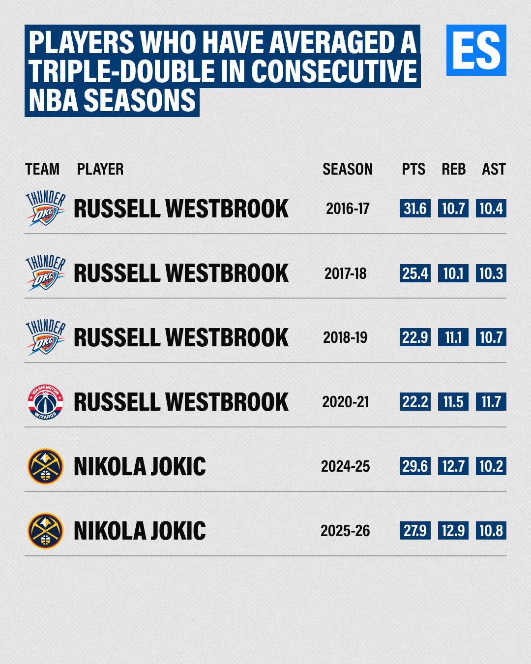单赛季场均三双球员:威少4次、约基奇2次、罗伯特森1次