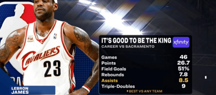 詹姆斯生涯46场对阵国王:场均26.7分7.8板8.5助,命中率51%