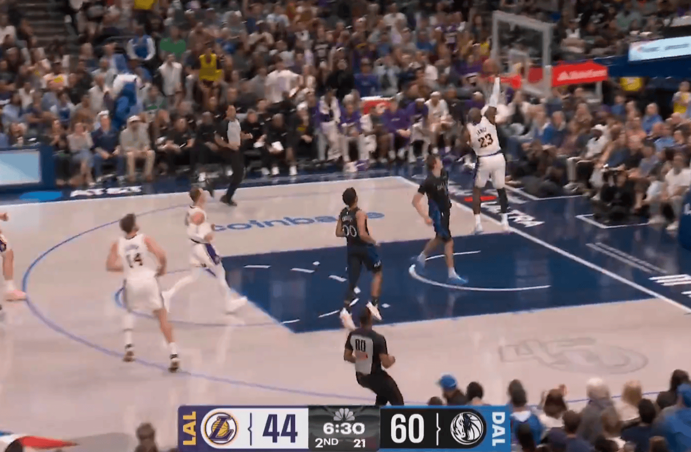 詹姆斯快攻反击单手飞扣得到16分,湖人追至14分打停独行侠