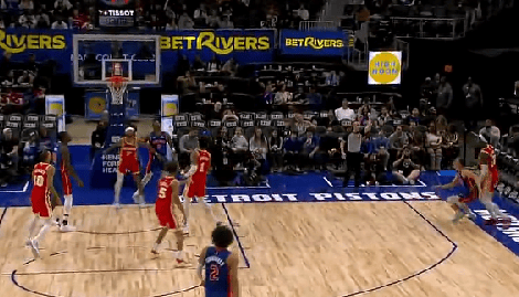 坎宁安点抢得手,一条龙反击顶开防守飞身扣篮得分