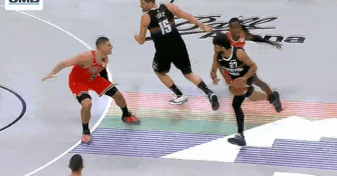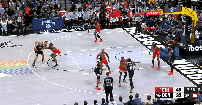 约基奇掉球失误被抢断,公牛快攻反击打成领先掘金18分