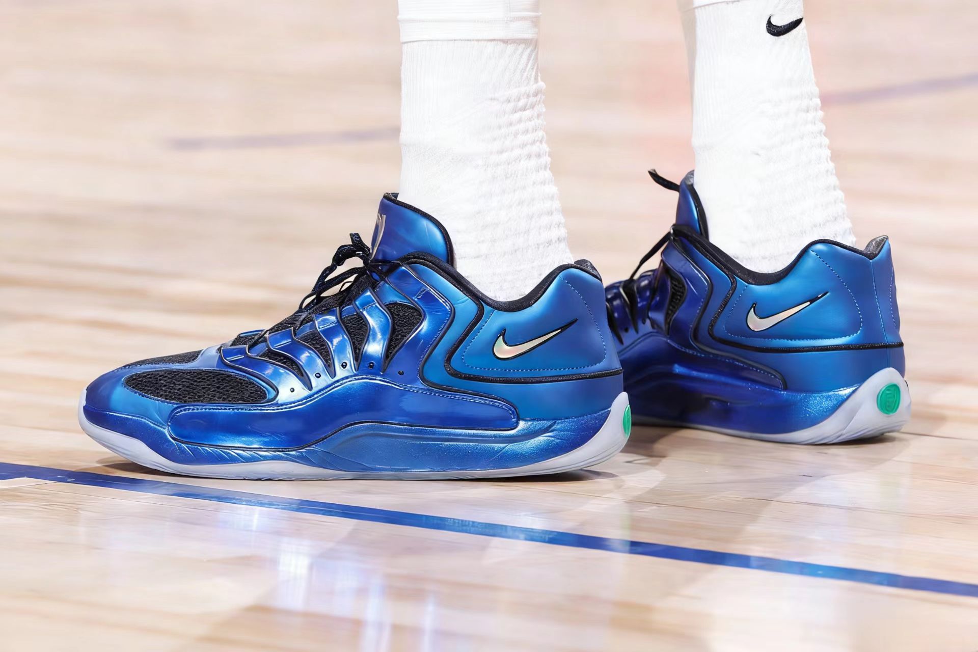 杜兰特穿着蓝喷配色KD18,得到32分7篮板3助攻1抢断1盖帽