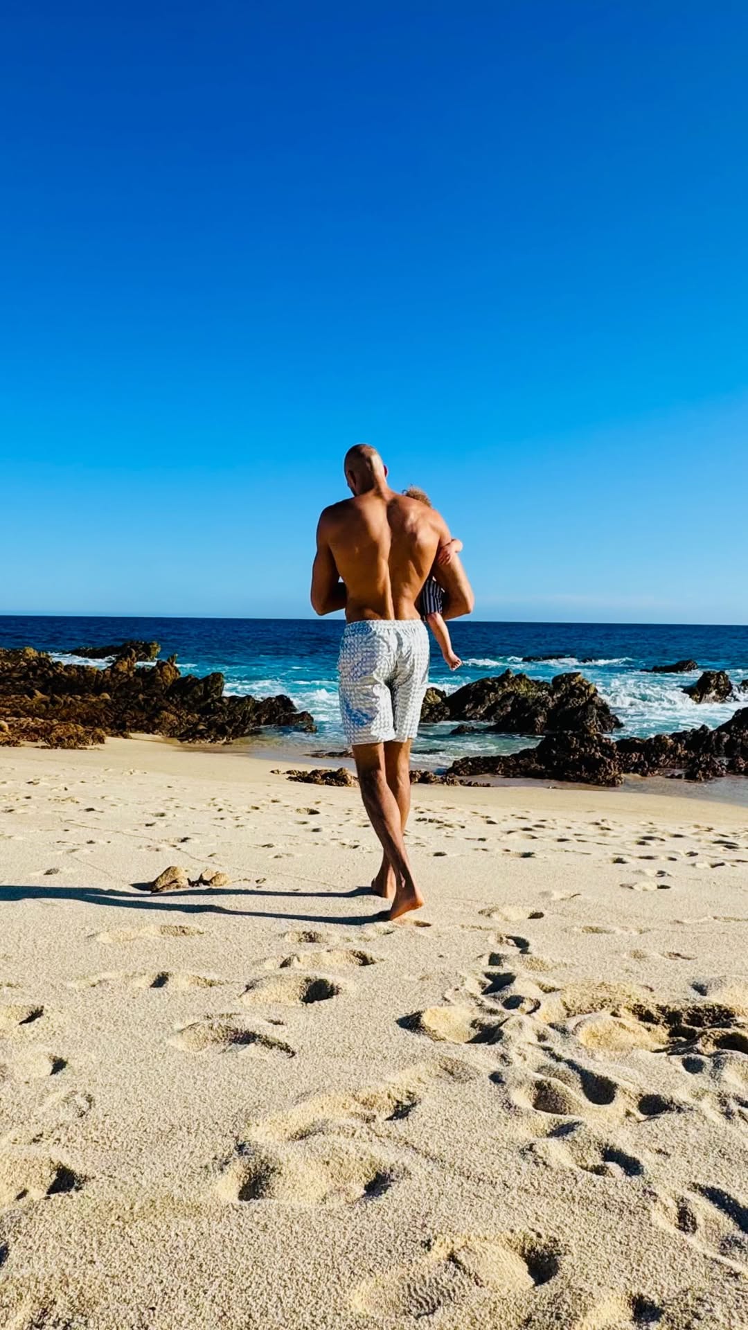 这背肌什么水平?戈贝尔Ins分享自己和孩子在沙滩散步的照片