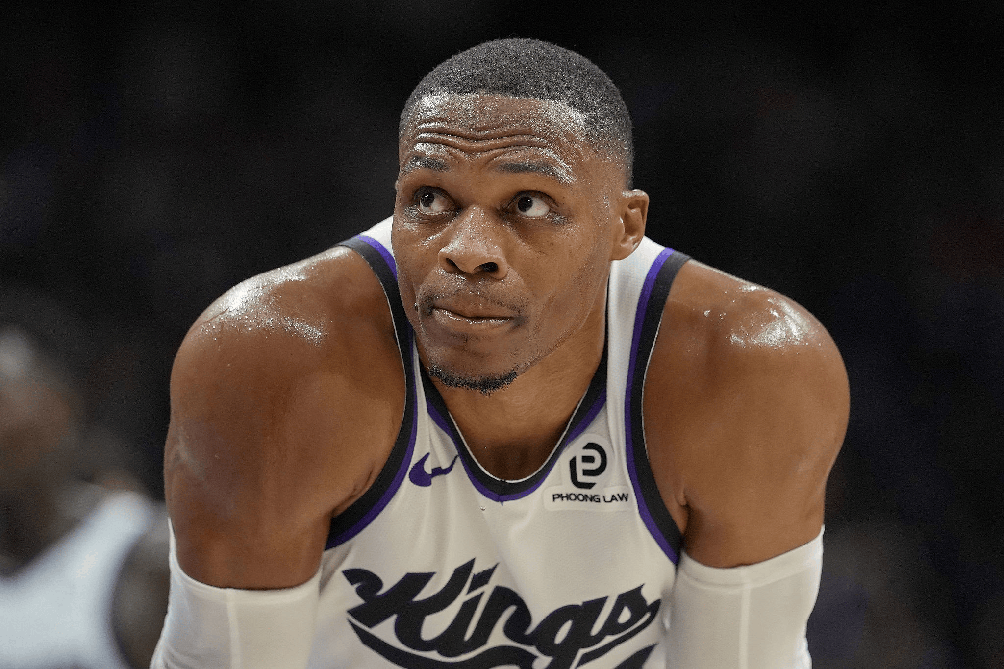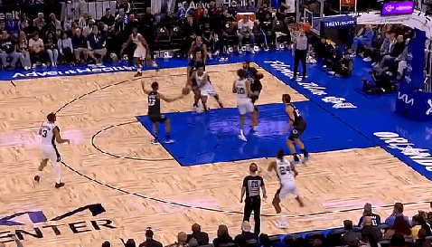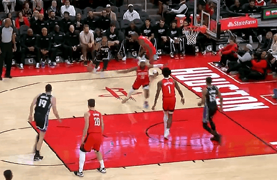 威少底角接球面对杜兰特防守,加速突破被吹踩线出界
