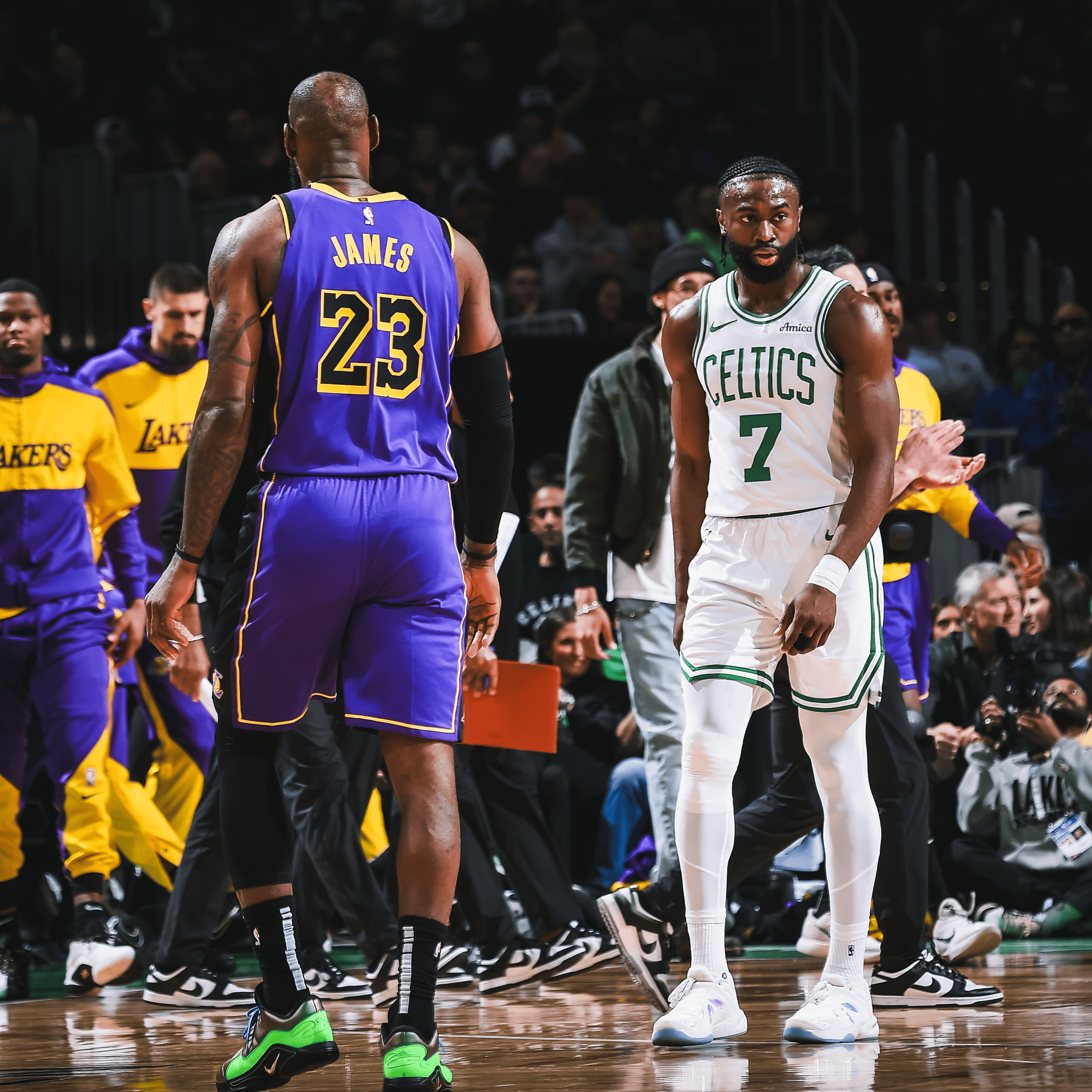 凯尔特人官方晒杰伦-布朗和詹姆斯赛场照:大明星,大舞台