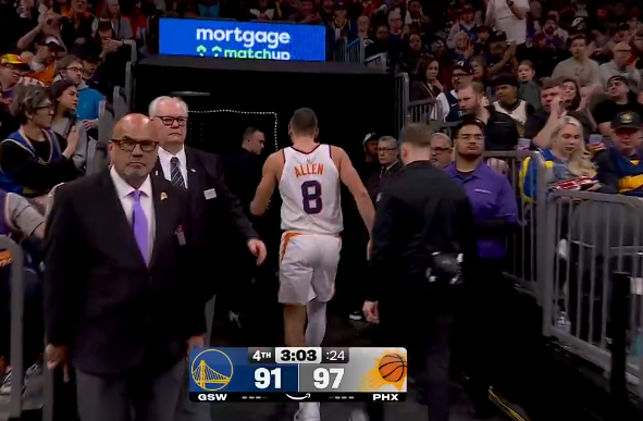 虎扑格雷森-阿伦腿部受伤走回更衣室,太阳还剩3分钟领先勇士6分