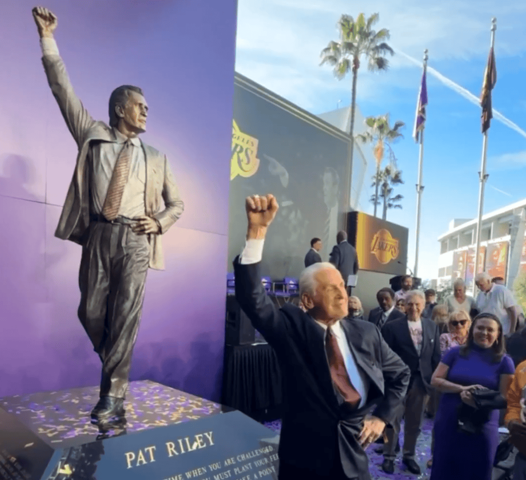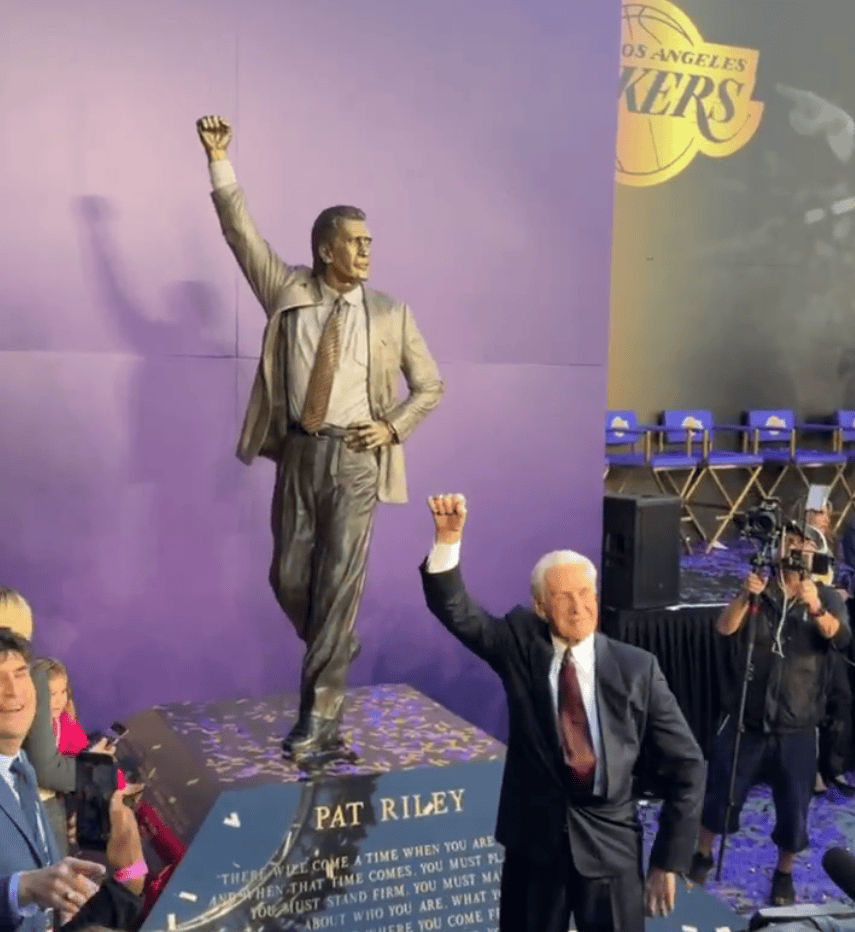 NBA官方晒帕特-莱利和雕像合影:首位拥有雕像的湖人主教练