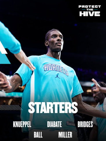 黄蜂首发名单:克尼普尔,迪亚巴特,布里奇斯,米勒,鲍尔